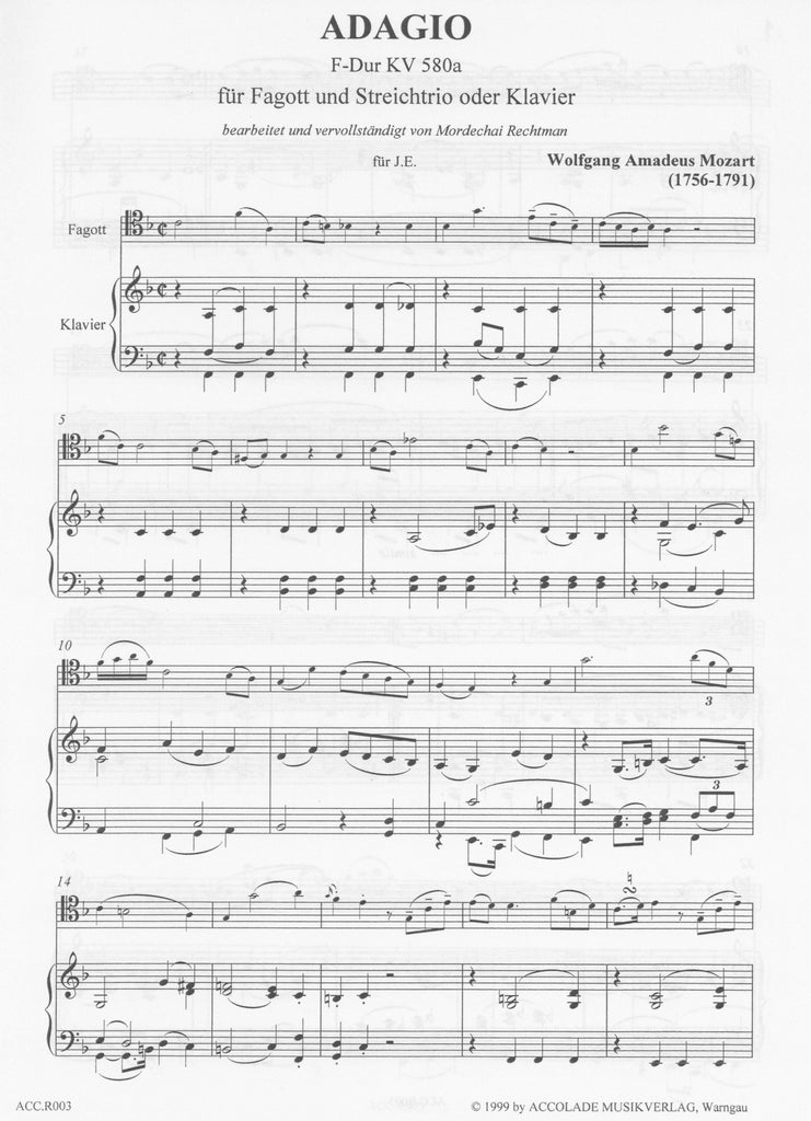 The Adagio in C Major, K580a, listed in the Koechel catalog as being for English Horn, Bassoon, and two Horns, exists only as a fragment. Mozart, probably in September 1789, filled out all of the parts for the first 28 bars. Instrumentation was listed only for "Corno ingelese", and the other parts were left unspecified. The editor, Mordechai Rechtman has had to complete the missing voices, as well as to decide on instrumentation. Ornamentation in the solo bassoon part by the editor is also given.