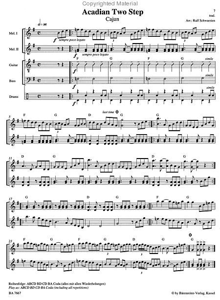 This is a collection of 15 arrangements of Zydeco/Cajun music. It is scored for 2 melody lines, a bass line, guitar and percussion. Set includes parts for Melody I & II in C, Bb, and Eb, a bass part in C, Guitar, and Percussion set. Other combos than that which is listed are possible.