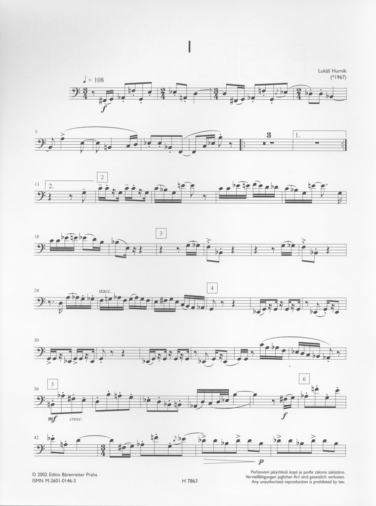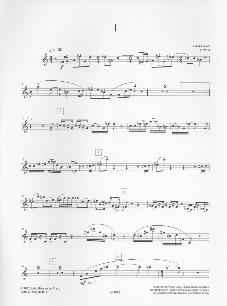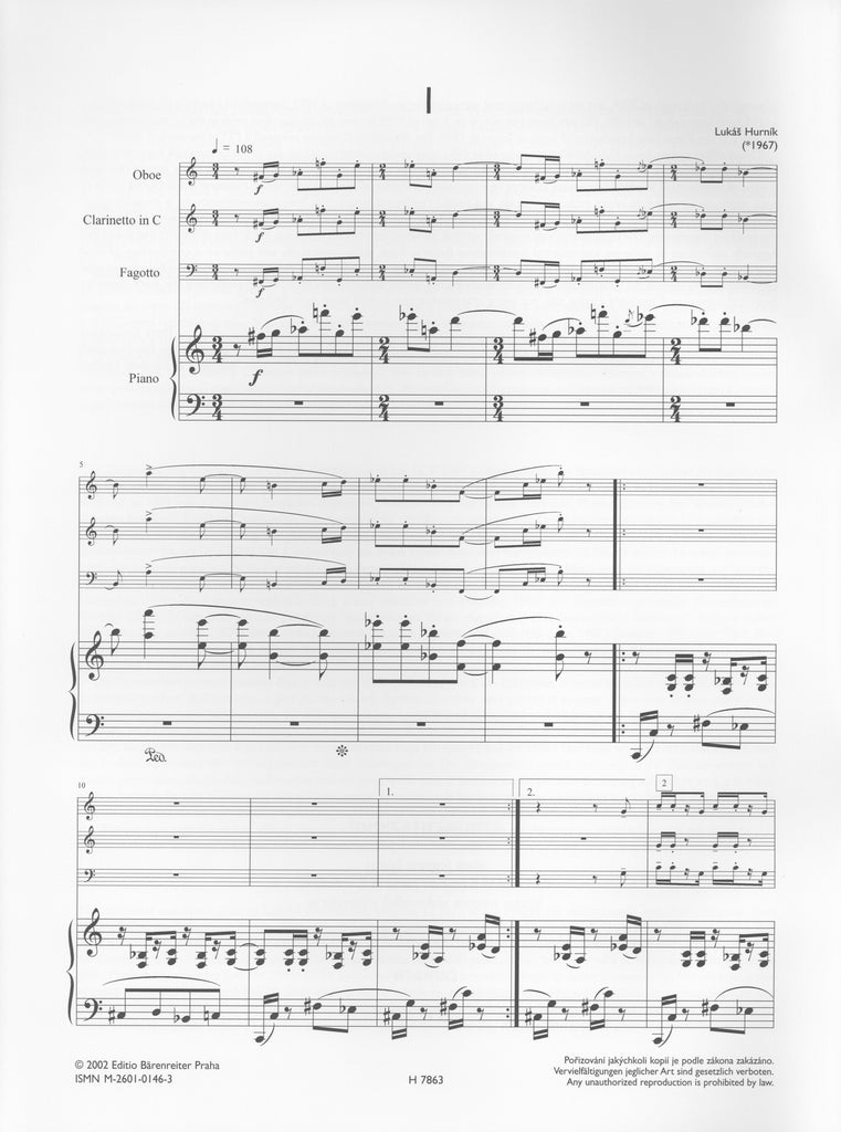 The chamber piece Fusion Music was written in 1991 after being commissioned by the In modo camerale Ensemble under whose interpretation it enjoyed more than 100 performances all over Europe. In its character it falls among the many works in which classical composers attempt to incorporate elements of jazz into their compositions. Lukas Hurnik looks to rock music, to its ostinatos, sharp guitar harmonies, and baleful rhythmic tampo/ The first movement contains virtuoso, quais-improvised solos, the second combines blues with a chromatic fugue, and the third is a distinctly persistent rondo with references to the previous two movements. Despite the fact that the piece was originally intended for wind instruments (oboe, clarinet and bassoon) and the piano, it has often been performed on other instruments (e.g. flute, violin, cello and the piano or a combination of wind instruments, however, with a C instrument instead of the clarinet). Therefore, the present edition respects this varied scoring and suggests a variety of instrumental combinations.