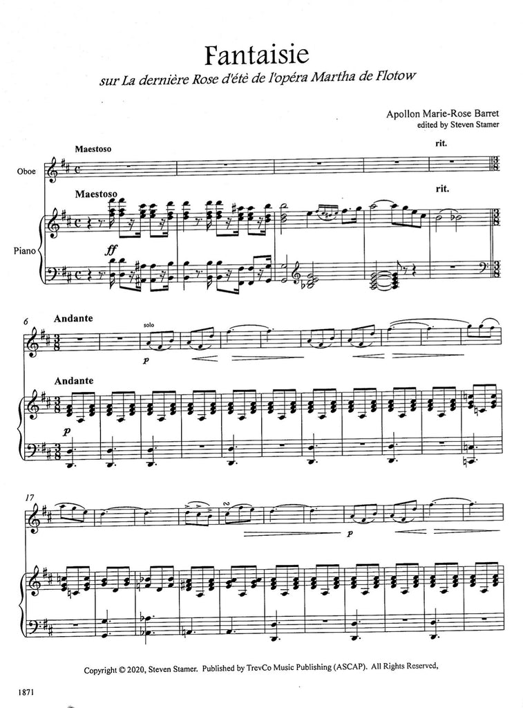 A.M.R. Barret's "Fantasie on The Last Rose of Summer" is a beautiful theme and variations on songs from the opera "Martha" by Frederich von Flotow. The centerpiece of this fantasy is Thomas Moore's "The Last Rose of Summer:, a classic Irish folk song. Also included from "Martha" are the arias "Ach, so fromm" and "Madchen, brav und treu". Typical of 19th-century fantasies, this piece is a showcase of gorgeous lyricism and of inventive and fun virtuosity for the oboe soloist. It's a perfect addition to any recital and an important piece of the 19th-century oboe repertoire.