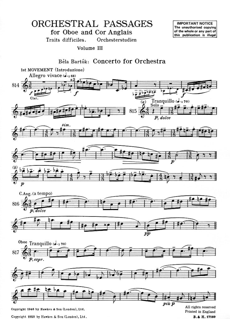 The material presented in these volumes is presented in alphabetical order, giving the classical repertoire in Volumes 1 and 2, and a collection of outstanding modern works in Volume 3. The Cor Anglais part is only included where that instrument occurs in the original score. Composers include Bartok, Borodin, Britten, Delius, Elgar, Holst, Mussorgsky, Ravel, Prokofieff, Rachmaninoff, Rimsky-Korsakov, Richard Strauss, and Stravinsky.