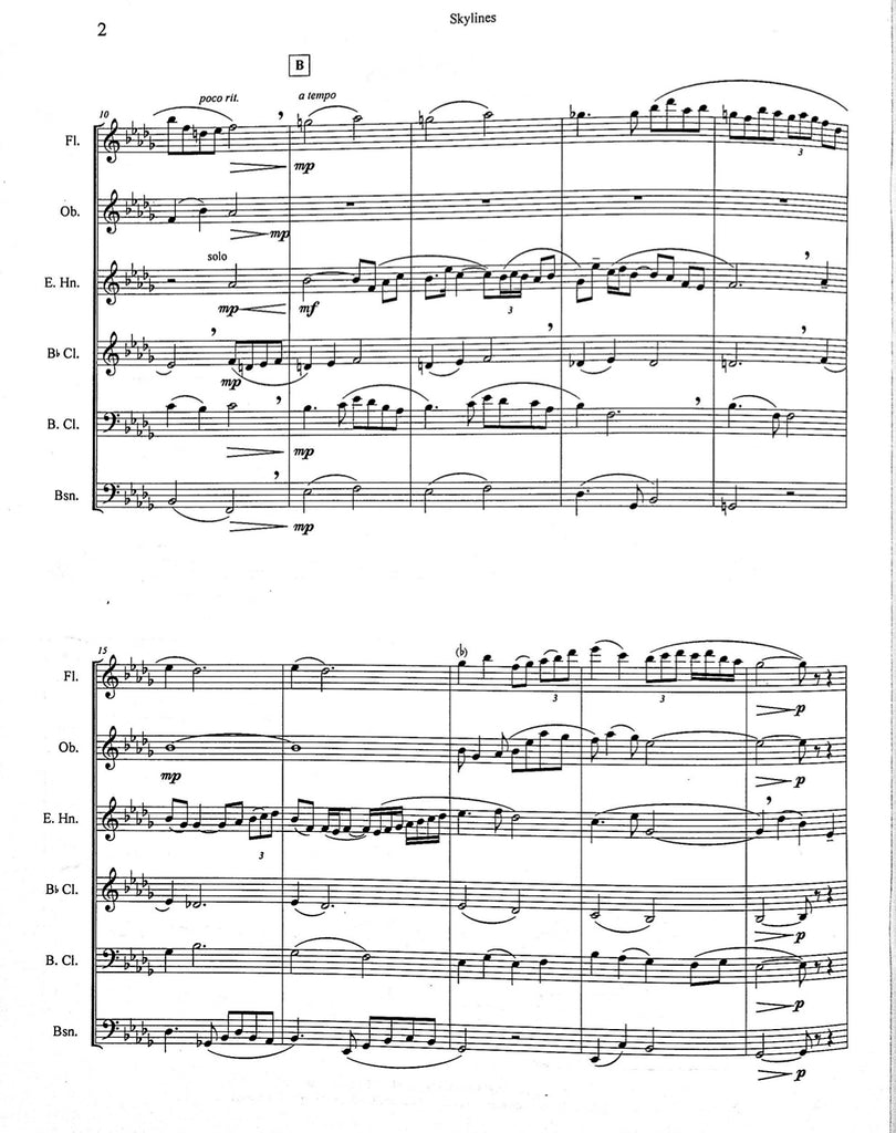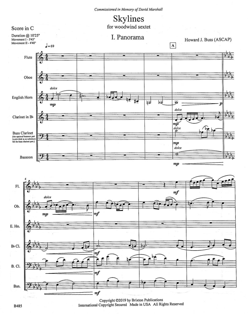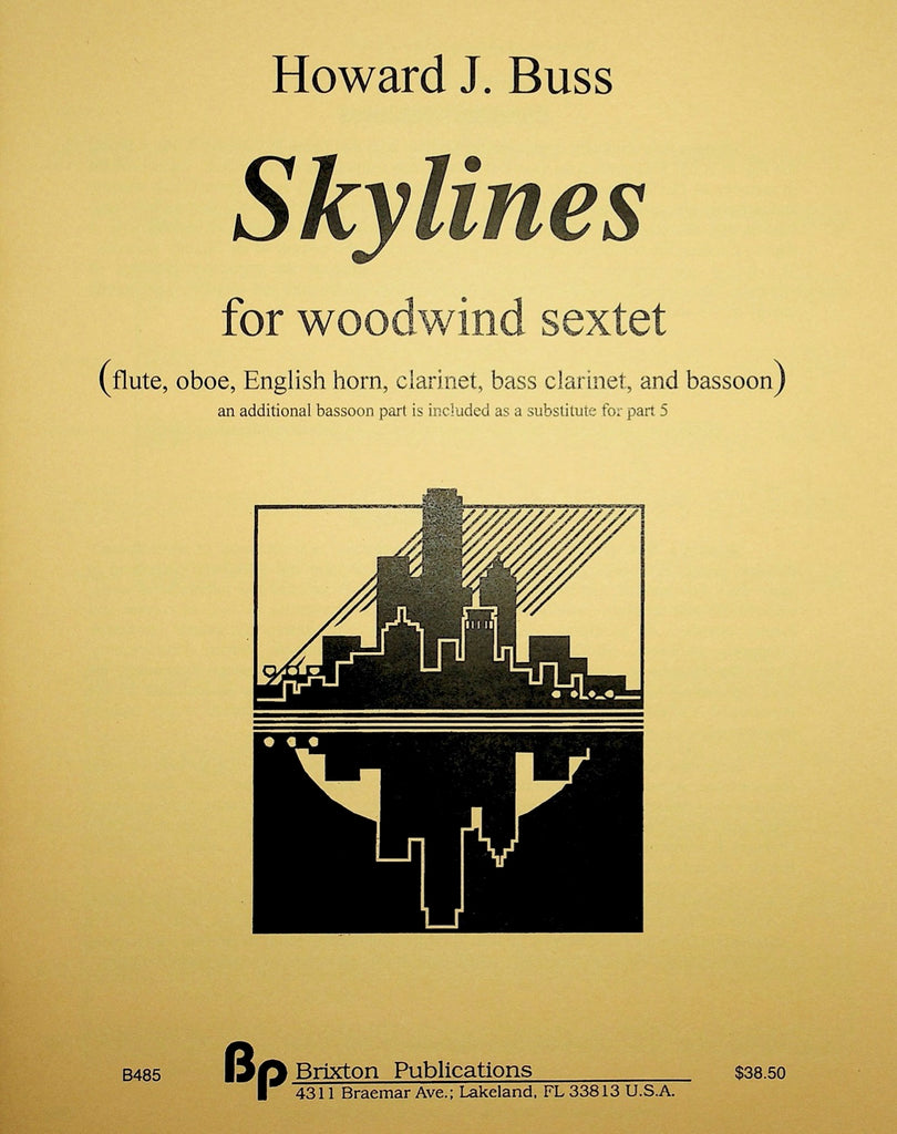 Skylines was originally composed for English horn and piano by Howard J. Buss in the Fall of 2002. This version for woodwind sextet was commissioned in 2019 by Victoria Ward in memory of David Marshall. It is scored for flute, oboe, English horn, clarinet, bass clarinet and bassoon. (An additional bassoon part is provided as a substitute for part 5, the bass clarinet. Cast in two movements, Skylines is a picturesque musical urban portrait. No specific city is depicted; rather, the composer captures, in a broad manner, the essence of the big city spectacle. The lyrical and majestic first movement, Panorama, suggests the expensive grandeur of cityscape. The second, Amid the Spires, is hugely influenced by jazz and captures the dynamic energy of life on the busy streets