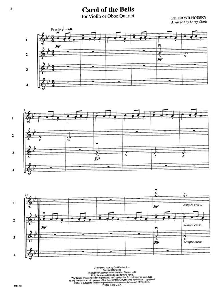 This title comes as one performance score. There are no individual parts. Leontovich and Wilhousky's extremely popular Carol of the Bells is now available in Carl Fischer Music's Compatible Series. Arranged by Larry Clark, string and wind players alike can now play this timeless classic together in any configuration. Perfect for use in a school setting, the flexibility of this series will make it easy to program your holiday ensemble events and give students a chance to experiment with different instrument combinations.