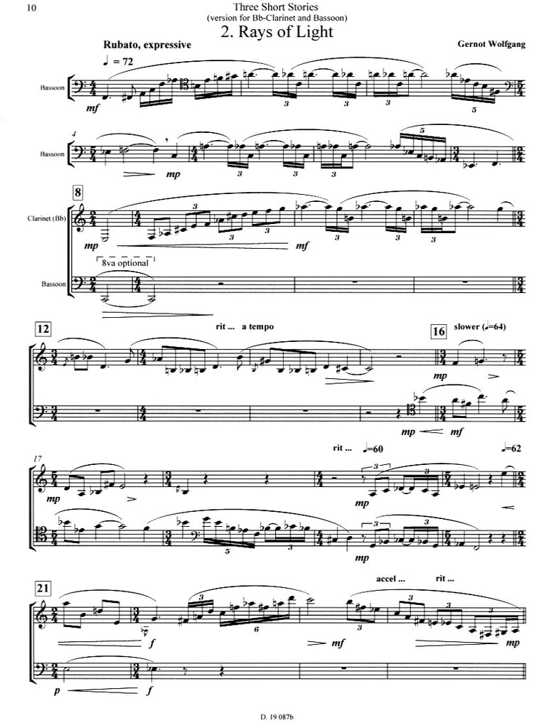 "Rays of Light" is lyrical in character, and is almost more a composition for two solo instruments than a duet. Bassoon and viola (clarinet) shape the piece trading solo passages, with only a few connecting measures in between in which the instruments interact. Only in the last couple of measures do the two parts unite to create a true ensemble sound.