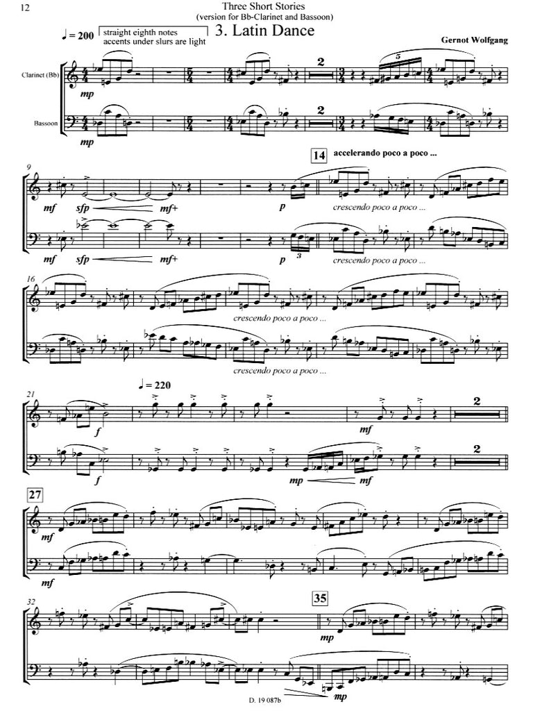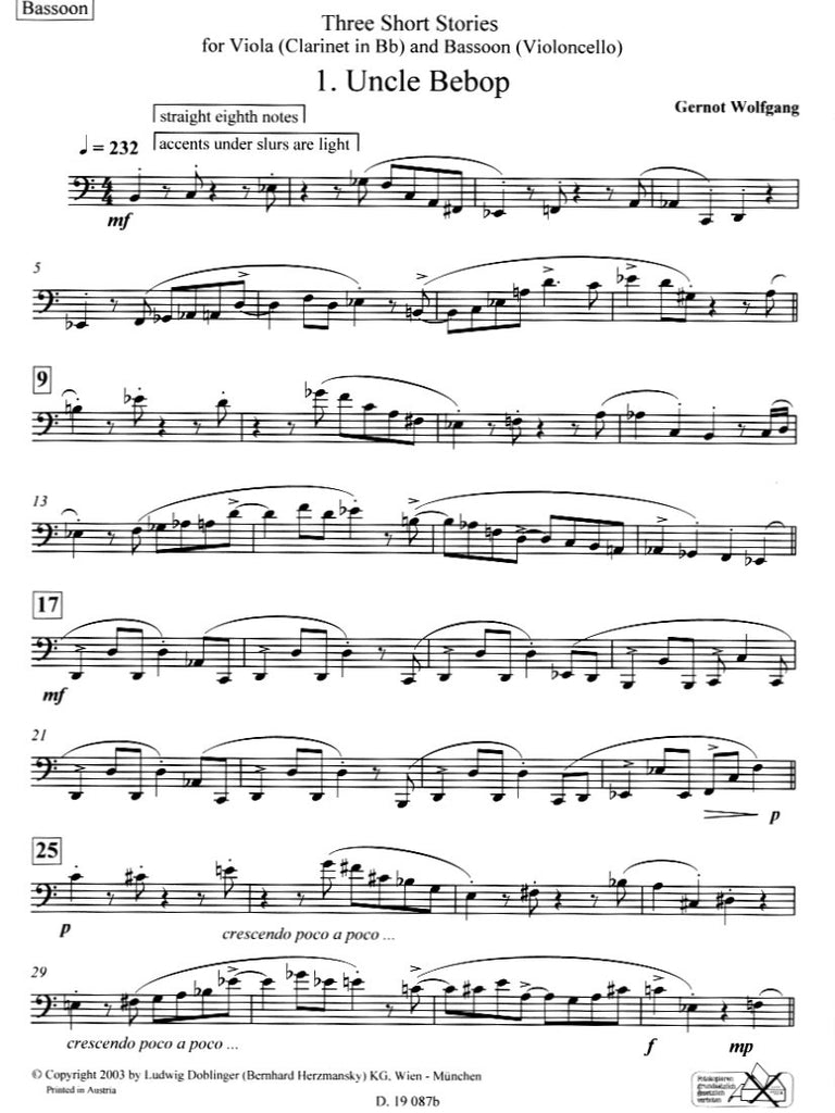 Three Short Stories- like my other chamber pieces- combines musical elements from the world of jazz with compositional techniques predominantly found in classical and 20th century concert music. The jazz aspect of the composition is audible through the extensive use of idiomatic rhythms, whereas the elements of harmony, counterpoint, and development are drawn more from the realms of the above mentioned concert musical styles. Three Short Stories was originally written for viola and bassoon, but the piece also exists in arrangements for clarinet (Bb) and bassoon, as well as for viola and and cello.
