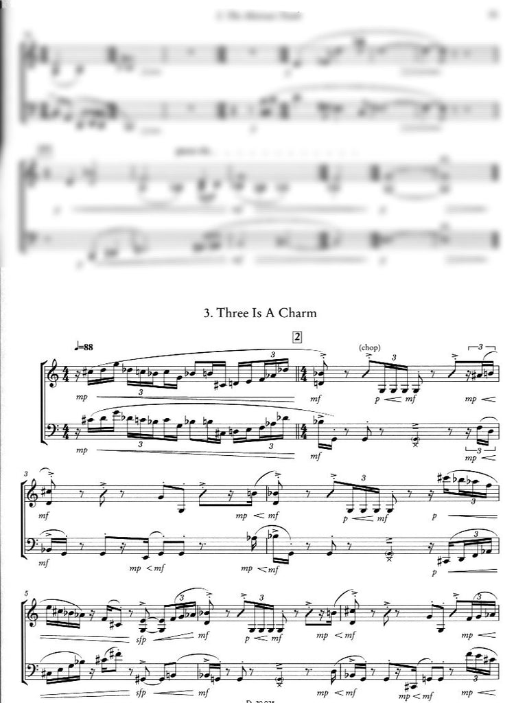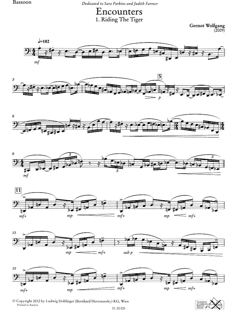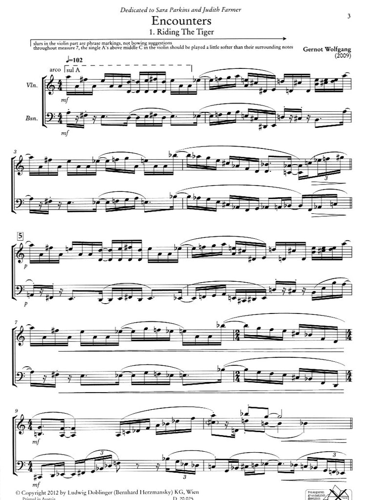 Encounters for violin and bassoon was composed in 2009. It is the fourth and final piece in a series of duos featuring the bassoon together with a string instrument of the orchestra. The other three pieces are Three Short Stories (viola and bassoon), Common Ground (cello and bassoon) and Low Agenda (bassoon and double bass). The composition is in three movements. The outer movements are based on energetic, often funky grooves and feature special instrumental effects, such as slides and chopping on the violin- performance techniques borrowed from bluegrass-style fiddle playing- and multiphonics on the bassoon. The quiet inner movement provides balance in the form of unaccompanied lyrical solo passages.