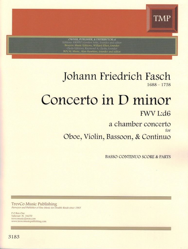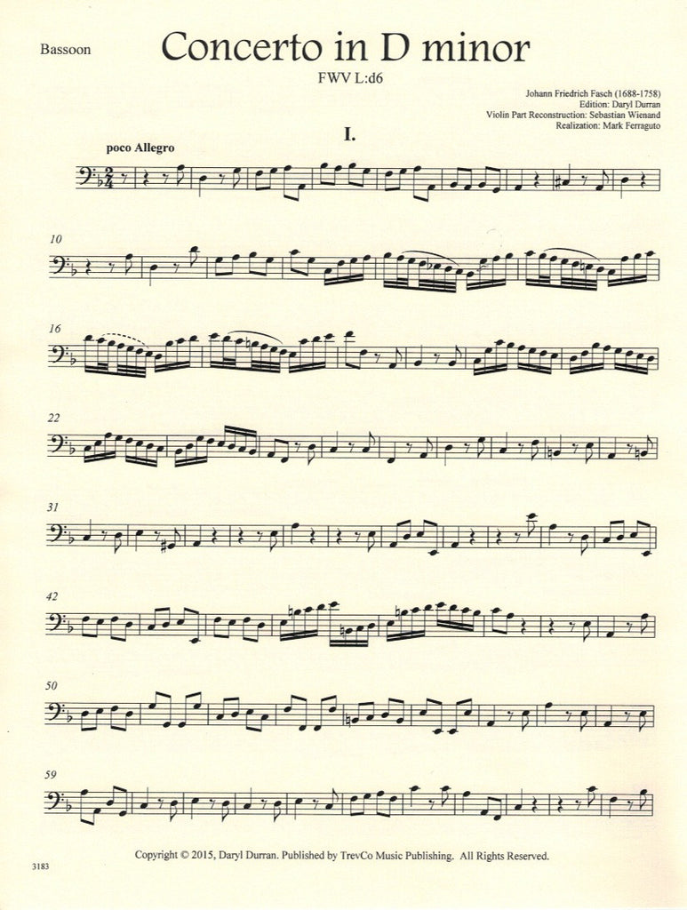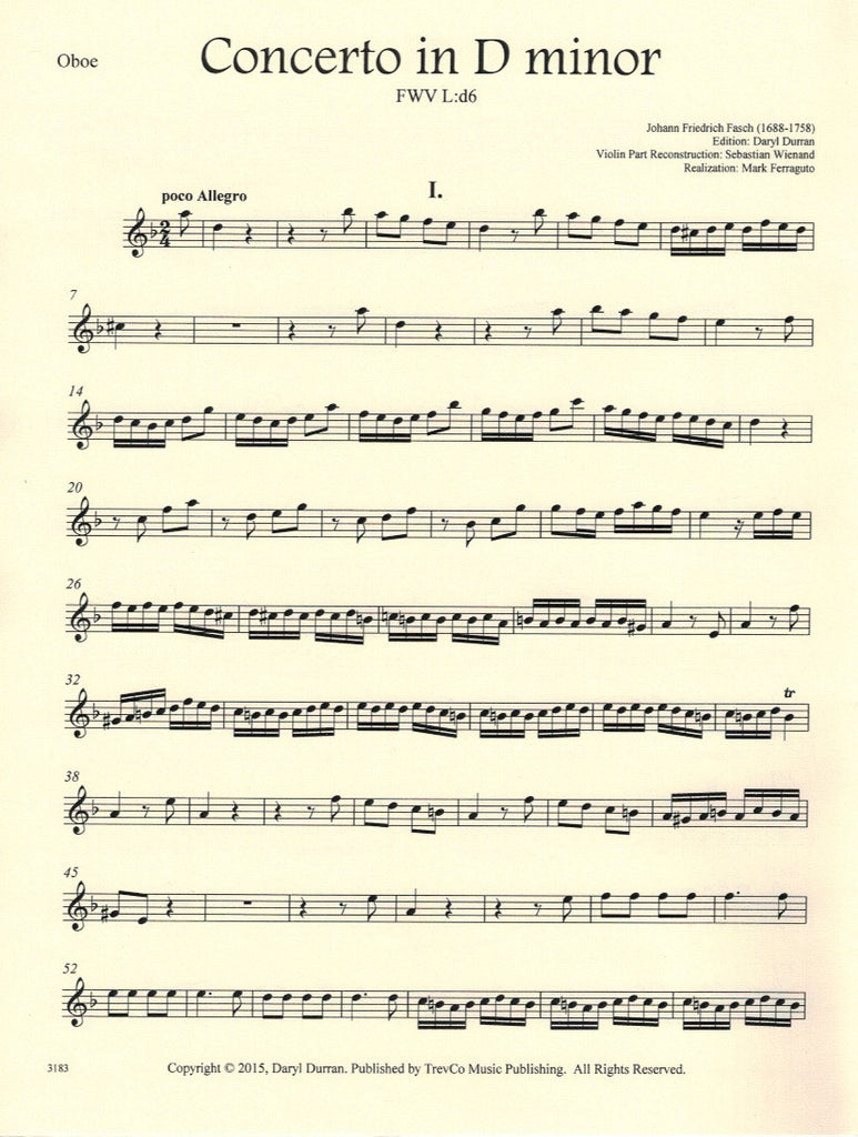 This edition comes with a continuo score, solo oboe part, solo violin part, solo bassoon part, and a basso part, to be played on any bass-clef instrument. Edited by Daryl Durran. Violin Part reconstructed by Sebastian Wienand. Continuo realization by Mark Ferraguto.