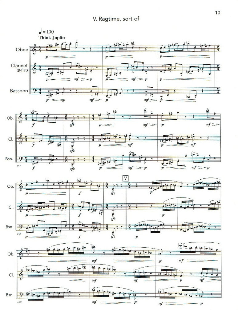 Seven Shards for Trio d’anches (or “trio of reeds”—oboe, clarinet and bassoon) is a rondo of four developing refrains, interspersed with three episodes. The texture is contrapuntal and the tempo brisk throughout (no hymnody, here), and the brief shards are to be played in succession without significant pause.