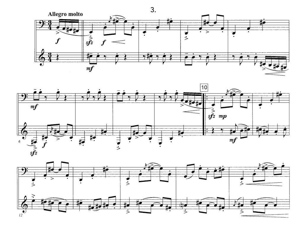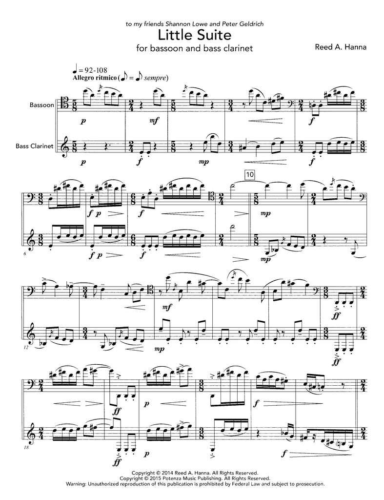 Little Suite is a short work for bassoon and bass clarinet that I wrote in 2013-14 as a gift for my friends, Shannon Lowe and Peter Geldrich. The movements are written in three distinct musical styles: the first movement is inspired by clarinet lines in the opening section of Stravinsky's Symphonies of Wind Instruments, and the second movement by the Passacaglia in Krysztof Penderecki's "Symphony #3". The third movement is an original dance tune that I sometimes jokingly like to refer to as a 3/4 rhumba.