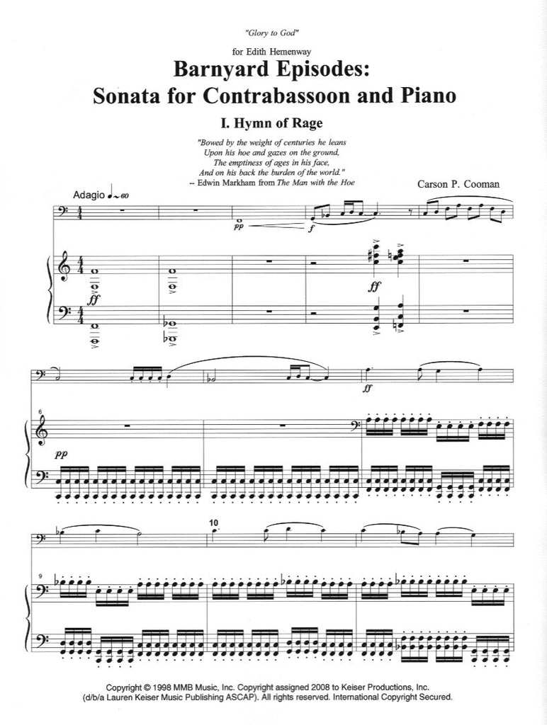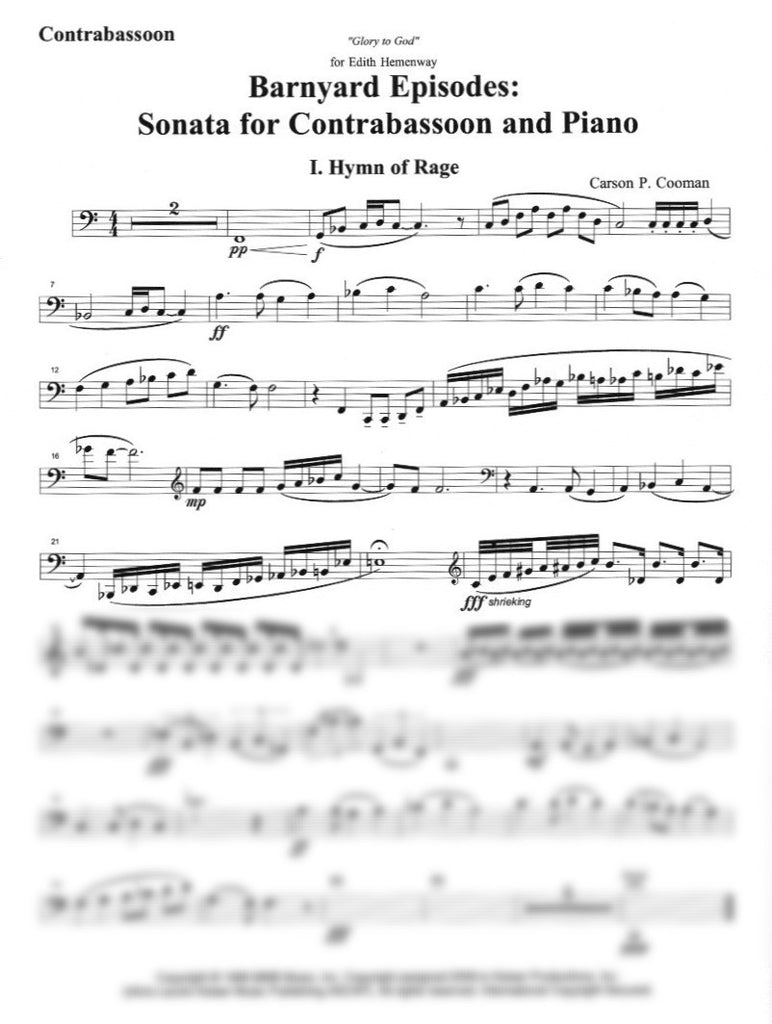 Barnyard Episodes: Sonata for Contrabassoon and Piano (1998) was commissioned for the 1999 International Contrabassoon Festival in Salt Lake City, Utah. The work is in three movements and is scored for contrabassoon and piano. This work makes use of the entire range of the contrabassoon, from its lowermost to its uppermost registers including quick jumps from the top to the bottom and extended playing in the topmost register. It requires a skilled contrabassoonist.
