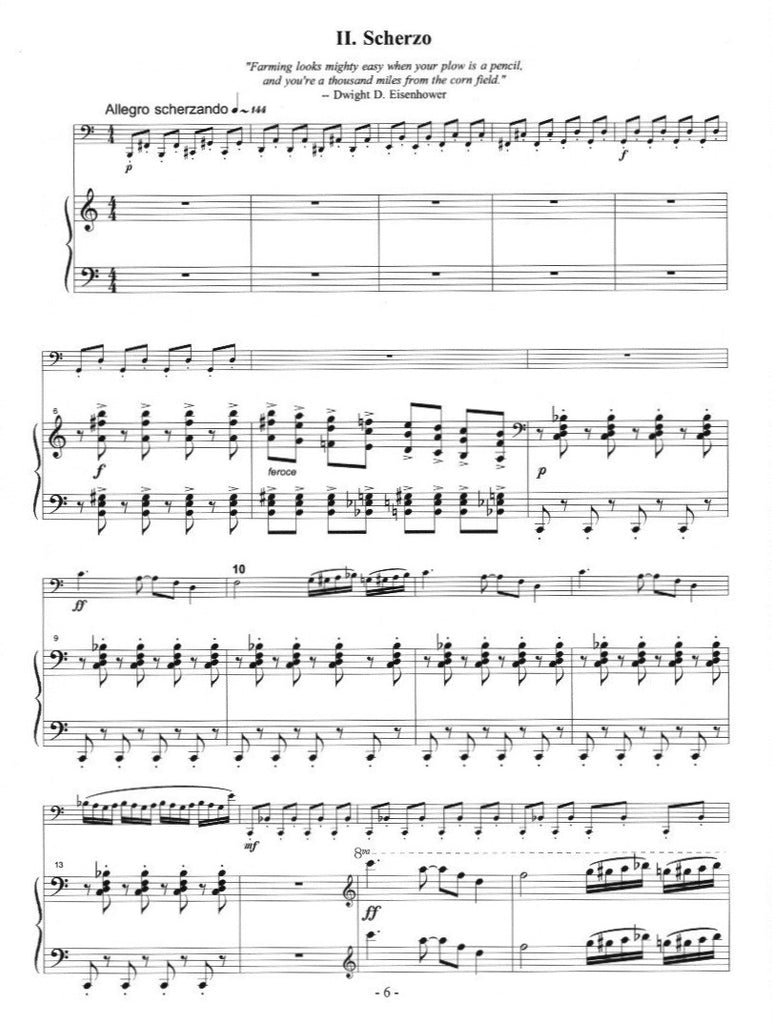 The second movement, Scherzo, is a fast, driving, playful movement which takes a theme of uneven rhythm and treats it in a variety of fashions. Themes and accompaniments are passed back and forth between the contrabassoon and piano. The movement builds up in a climax towards the ending and then ends very suddenly.