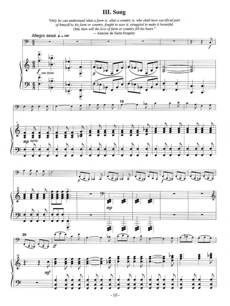 The third movement, Song, is a bouncy and fun movement that presents an endurance test for the performer as the contrabassoon plays non-stop for almost the entire movement. This movement makes great use of the entire range of the contrabassoon demonstrating its versatility and unique sounds throughout the entire compass of its range. The American folk tune The Farmer in the Dell serves as the main theme for the movement. The opening declamatory chords struck by the piano provide the basic pitch intervals that pervades the entire work as it travels through both F-major and B-major tonalities. Both the contrabassoon and piano present a variety of countermelodies and variations based on the folk tune theme including a saloon music-like middle section. There are a variety of virtuosic scales and runs for the contrabassoon including an unaccompanied cadenza in the middle of the movement. The movement ends on a note of exuberance.