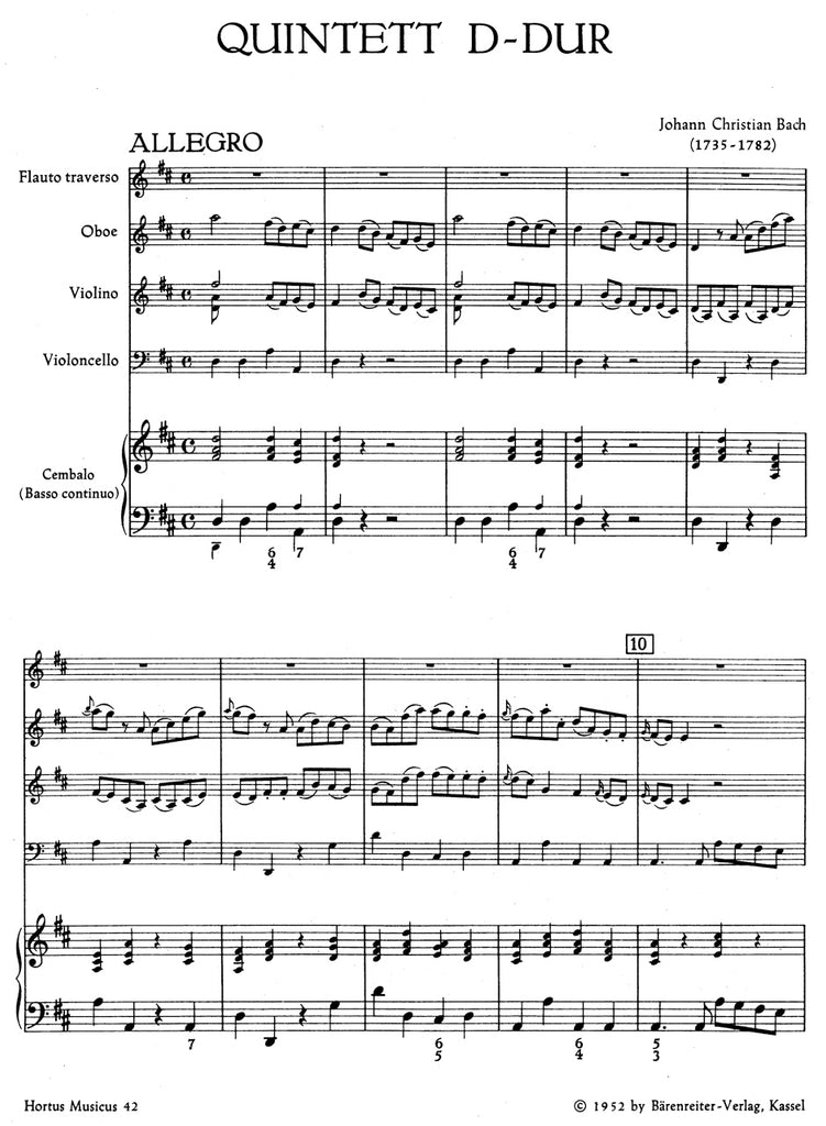 Edited by Rolf Ermeler. One of the most charming works by the "London Bach" is the present chamber music quintet. This quintet is probably one of the first compositions of its time to use an obligato harpsichord in chamber music with larger instrumentation. The inclusion of two wind instruments and two strings lends a particular color to the composition. Each instrument is given ample opportunity for prominence in solo passages.