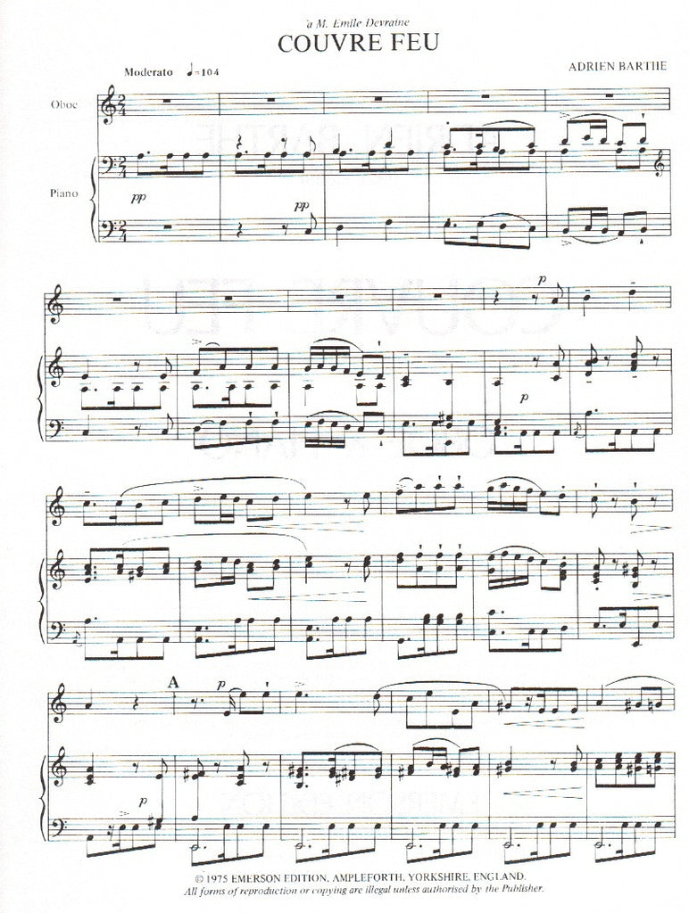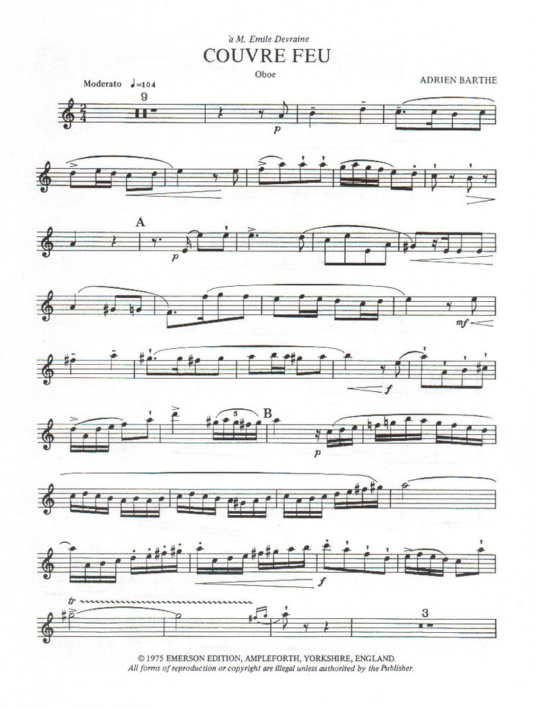 Couvre Feu (literally 'cover the fire', i.e. 'curfew') is one of six pieces for oboe or violin by Adrien Barthe, a 19th century bandmaster.
