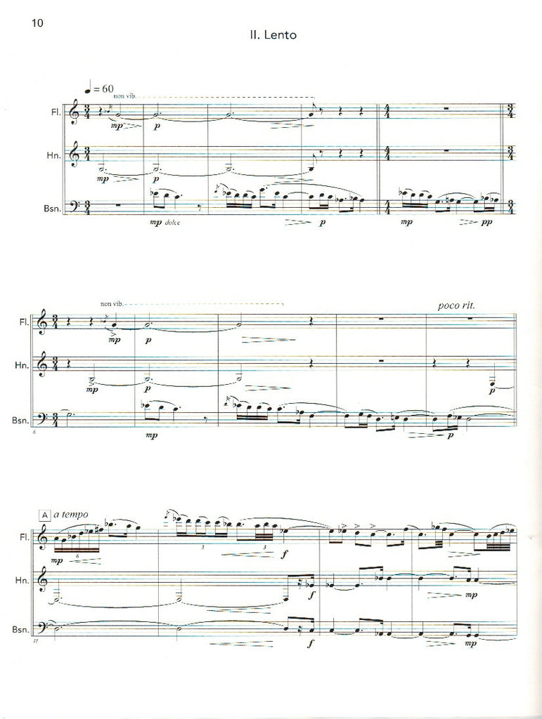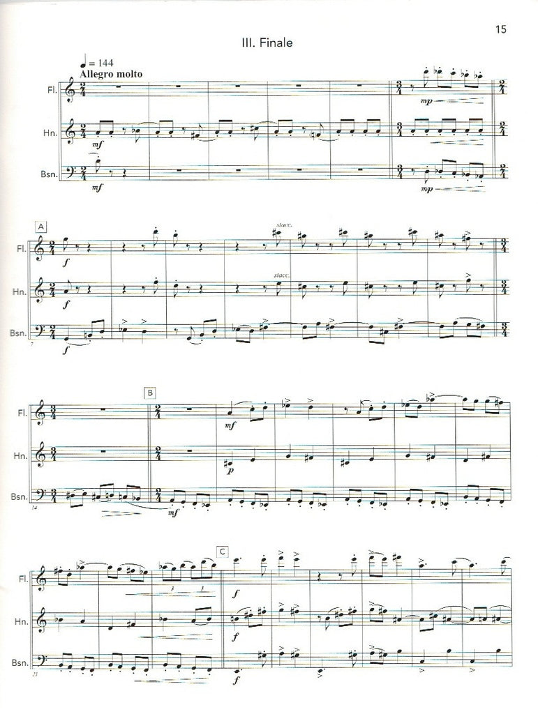 This work was sketched during August, 1988, and was completed during a vacation trip to Arizona in January of 1989. It is one of several works written for some of the less common combinations of wind instruments. The style is straightforward and melodic, and is generally pastoral in character, rising occasionally to dramatic points of harmonic tension and complexity, but maintaining an overall sense of lyric playfulness.