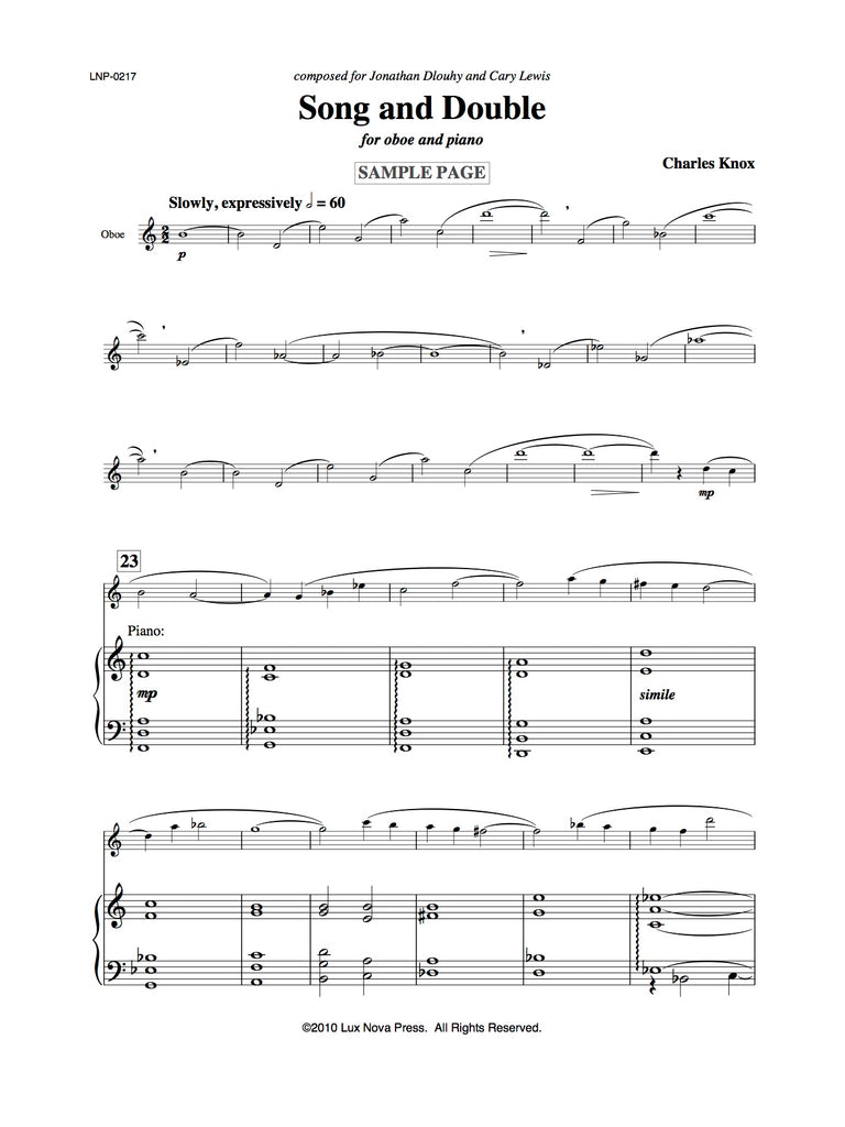 Song and Double is a lyrical tune for oboe and piano and a rather distant variation of that tune. Oboist Jonathan Dlouhy and pianist Cary Lewis gave the first performance of this piece, which was written especially for them, in 1984.