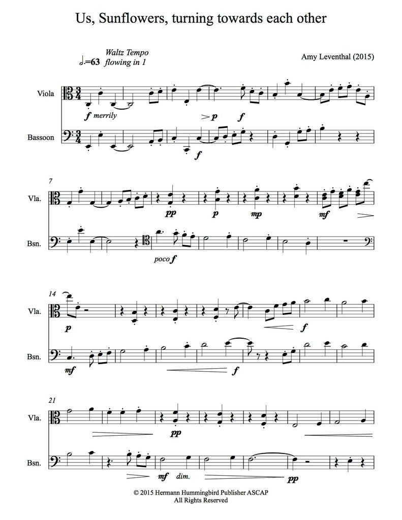 From the composer:This piece describes my friendship with three women: Amy Dorfman, Pat Gunter, and Stephanie Marlin, who live in Nashville, TN. I met each of these women when we were students at Indiana University. They all ended up living in Nashville and I in Atlanta. They each have become close friends. Their friendship with me is life-sustaining. I wrote this piece for Pat and me to play together. I think of my friends and I as life-filled sunflowers turning towards each other, as flowers do towards the sun, for nourishment, and this idea inspires the first movement.