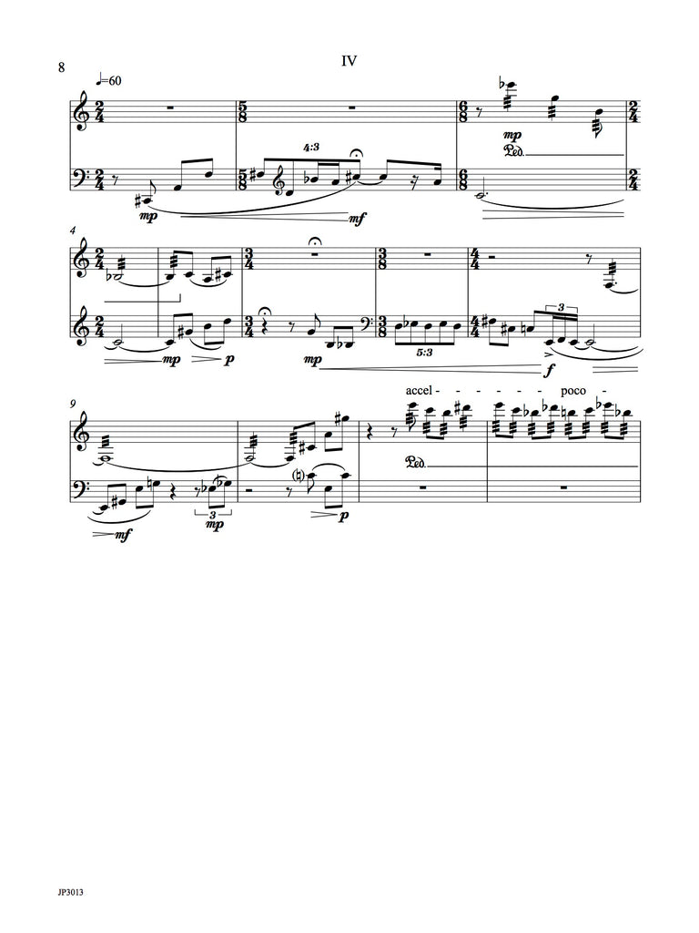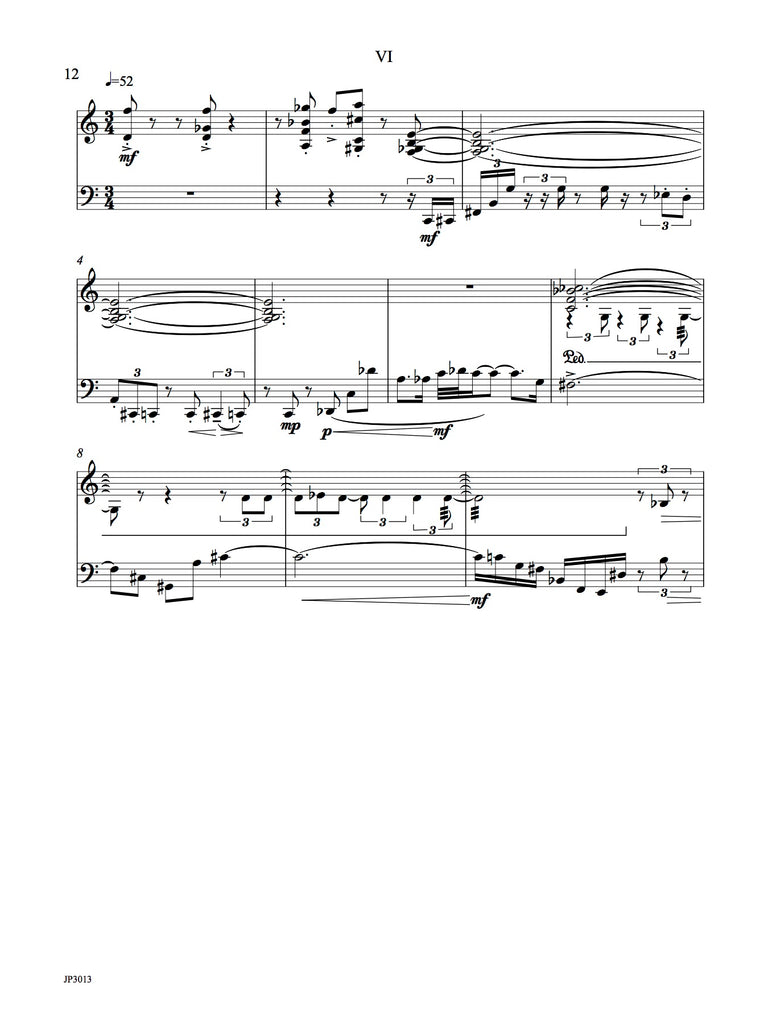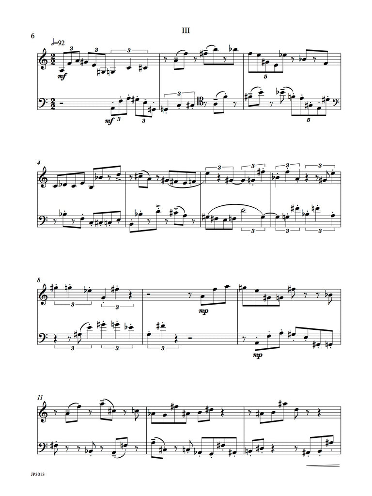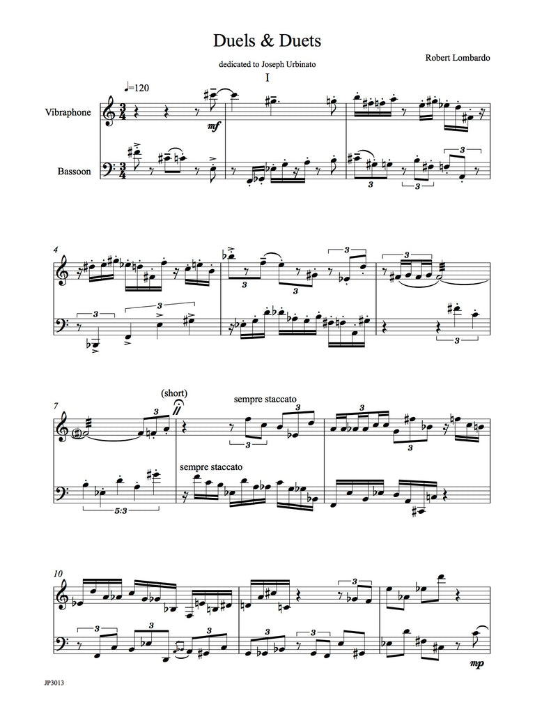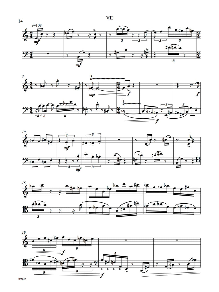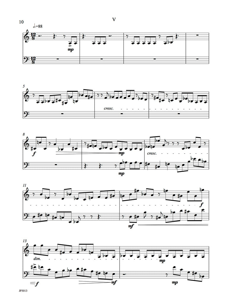 The work for bassoon and vibraphone has seven short movements. The rhythm within and between instruments is complicated. Technical demands are moderate. Colorful writing for this very unusual combination. Two performance scores included with easy page turns.