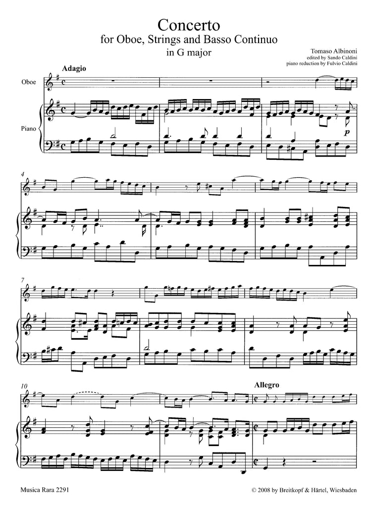 Edited by Sandro Caldini; edition for Oboe and Piano by Fulvio Caldini. This work is one of Albinoni's Concerti without opus, from approximately 1728. First modern edition.
