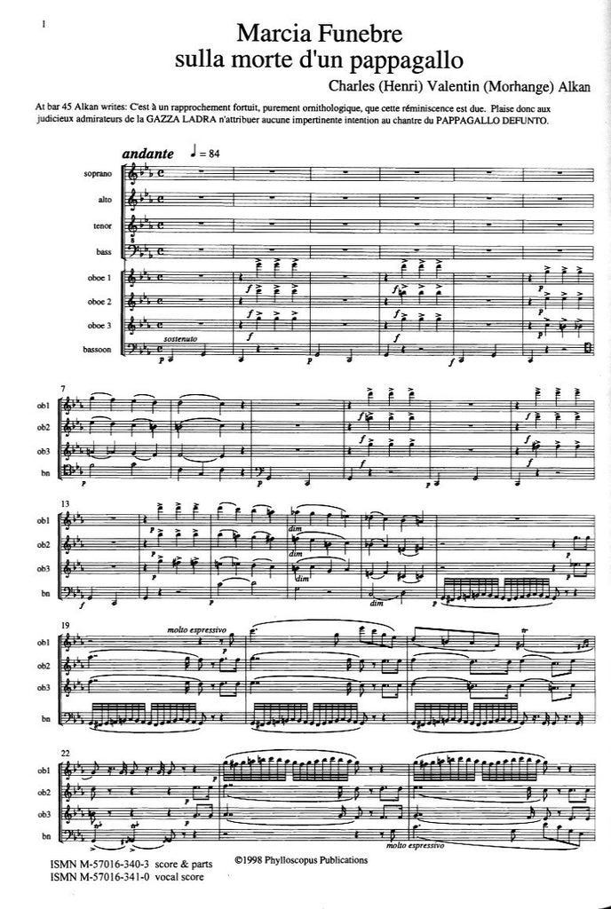 Marcia Funebre sulla morte d'un Pappagallo (Funeral March for a Dead Parrot) is a parody on everything from Rossini to Monty Python sketches (which Alkan would have no knowledge of, having died in 1888!). The simple words, starting with the French equivalent of "Who's a pretty Polly?" set a tone of tongue in cheek seriousness, which later gives way to a real sense of tragedy with the increasingly anguished cries of "Ah!". Rossini himself wrote witty, self-deprecating pieces known as the "sins of old age", one of them dedicated to his pet parrot, another to his dog. These were performed at parties, and Alkan may have had similar occasion in mind when he wrote this pastiche. Set includes Score and solo parts. No vocal scores, which are available separately on special order.