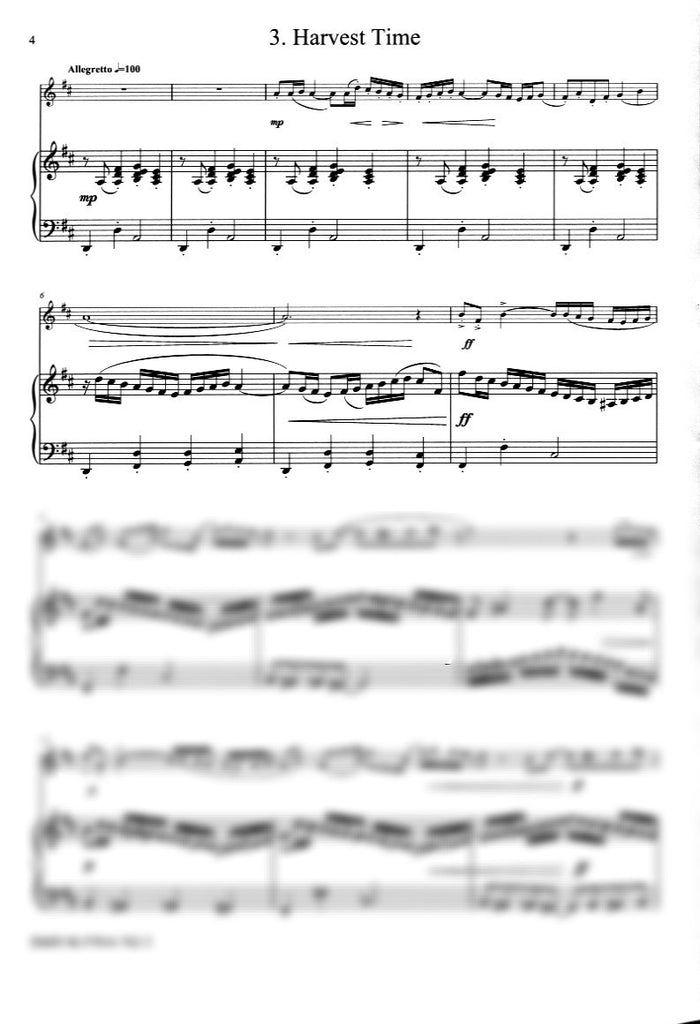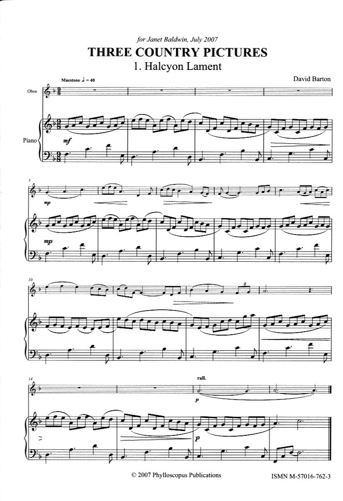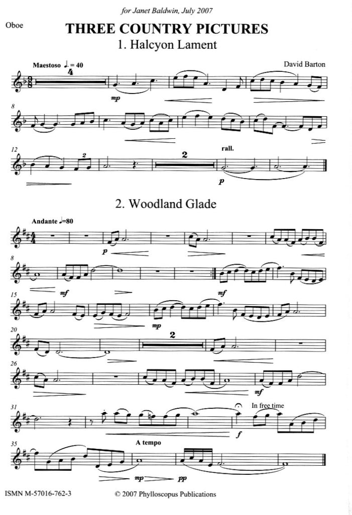 Three Country Pictures were written between 2005 and 2007 and reflect areas of country life. Halcyon Lament is a nostalgic look back at days gone by. One can almost picture the great television presenter Jack Hargreaves surveying the disappearing country ways of the South of England. Woodland Glade is a reflective piece suggestive of sun streaming through the willow trees on the banks of the River Itchen outside Winchester. The rhythmically intricate and-almost- pompous Harvest Times gives a feel for the importance of the land to farmers, and the great satisfaction of bringing in the annual harvest.