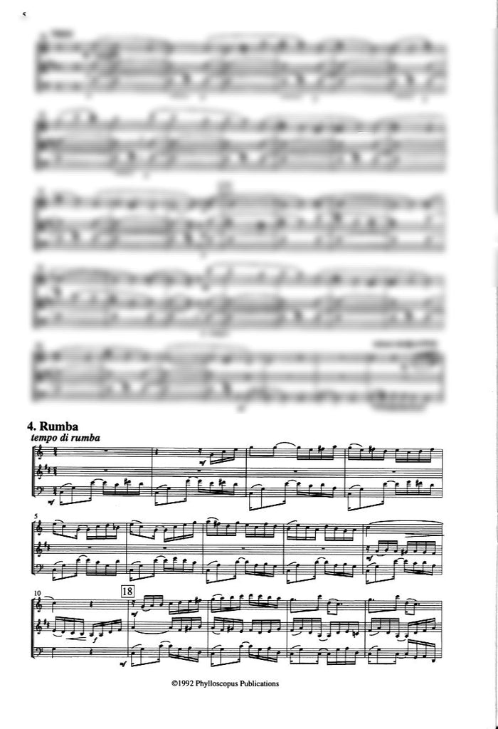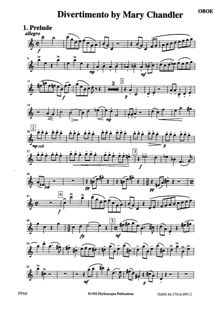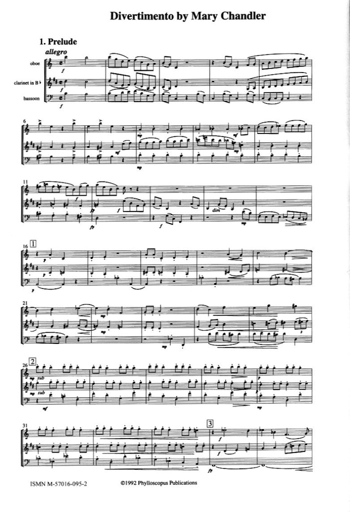 This work started life as a fun piece for the reed trio so popular with the French: oboe, clarinet, and bassoon. It consists of four movements. Later, Mary Chandler re-scored the piece for flute, oboe, and piano, to suit the group with which she was then working. It has been played in both forms.