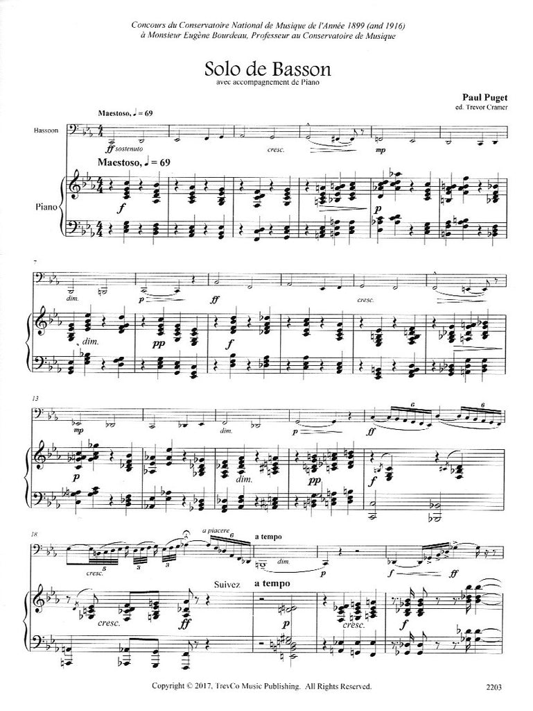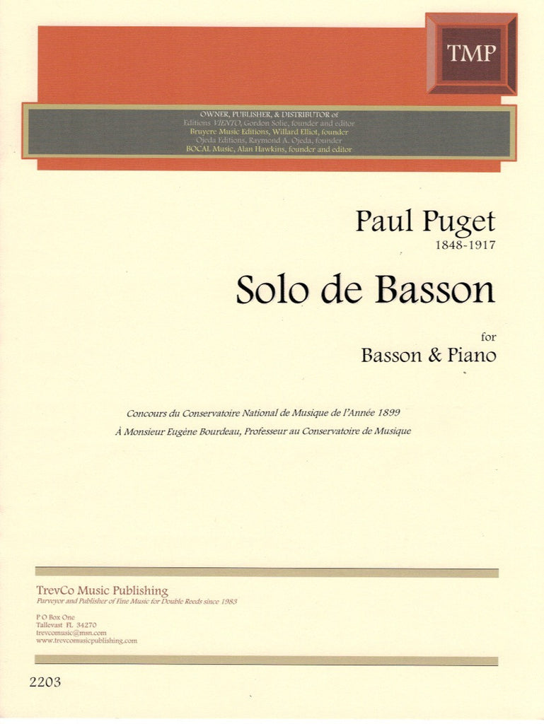 This work was written for the Concours du Conservatoire National de Musique de l'Annee in 1899. Edited by Trevor Cramer. The Solo de Basson begins with a slow and somber introduction, followed by a contrasting Allegretto scherzando. The chromaticism as well as the harmonic and melodic structure is inventive and challenging for both bassoonist and pianist. Written in 1899 for the Bassoon Concours at the Paris Conservatory, it was again the concours piece in 1916.