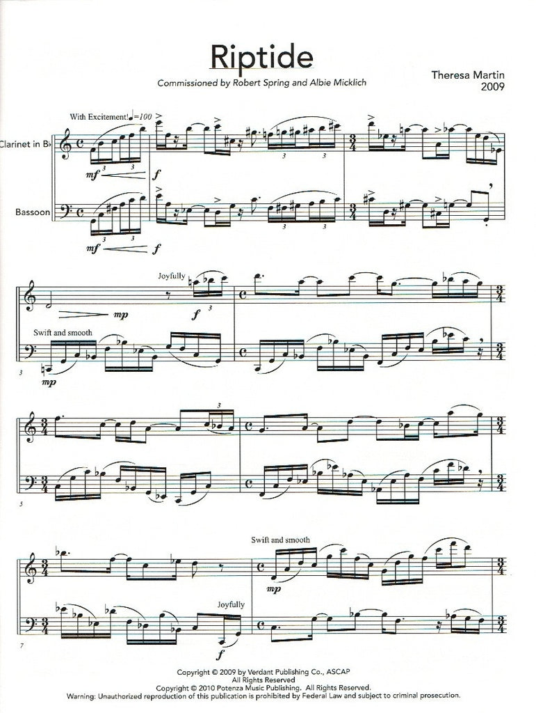Theresa Martin is a composer of energetic, melodious, and rhythmically driven music and often draws her inspiration from literature, images, nature, and personal experiences. Martin discusses her piece, Riptide 2009, commissioned by Robert Spring and Albie Micklich: