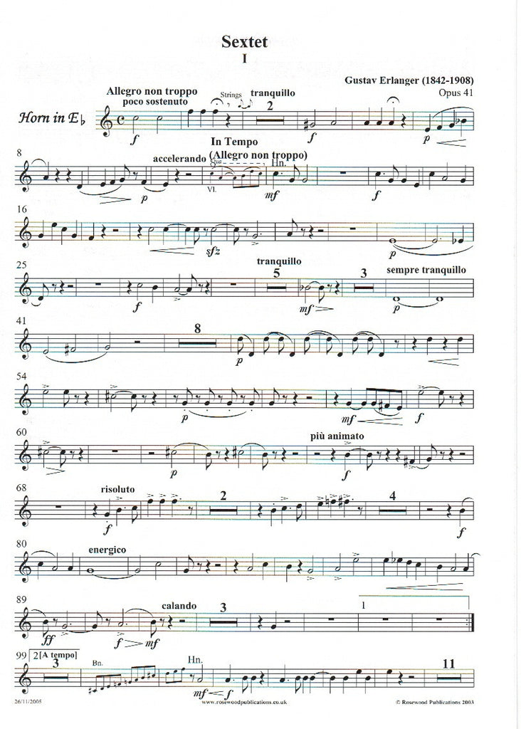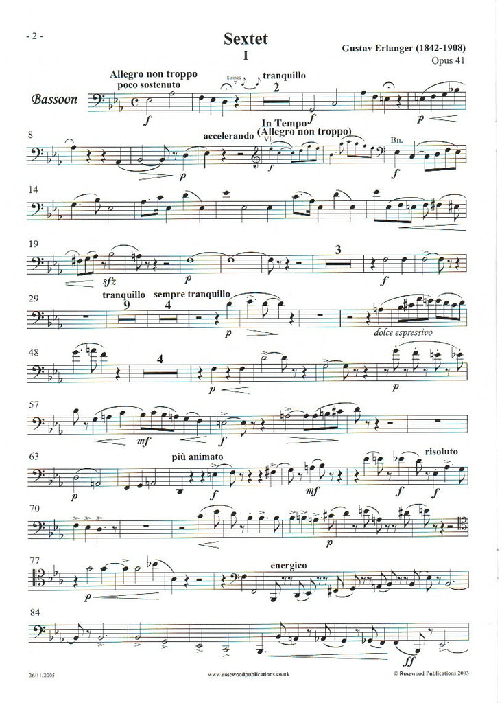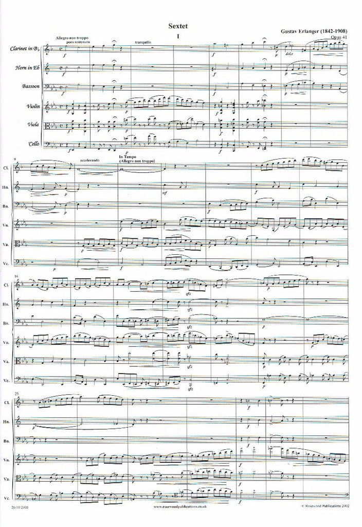 Gustav Erlanger was born in 1842, and studied with Karl Reinecke. His composition include a piano quintet and a violin sonata. This Sextet, Op 41, was written in 1888. It was also published at the time as a piano duet. An optional string bass part has been provided to make this a companion piece to the Beethoven Septet. Edited by John Wilcox.