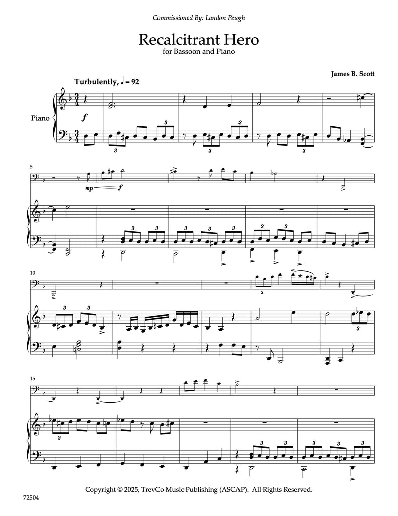 This work is based on the familiar tale of the phoenix and rebirth. In this story the bassoonist represents our recalcitrant hero, while the pianist represents both the hero's support and opposition. Our scene starts in the middle of a turbulent battle against an authoritarian oppressive force, with the odds pinned against our hero. The beginning section highlights points of dissonance and chaos to cement feelings of instability and wavering tenacity. Following is our section of rebirth. Influenced by works such as Verdi’s Requiem, this is a moment of reflection. The chaos is gone and the hero is left alone, forced to reflect in solitude. Out of this reflection comes hope and a re statement of their personal values. The hero then returns to the fight with a new found sense of resolution. The music returns to parts of the musical material from the introduction, themes are expanded and take on new meaning. The underlying pulse gets more energetic, propelling you to a triumphant ending that has a true sense that the fight is over.