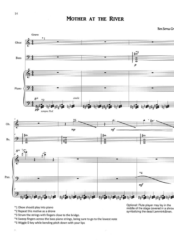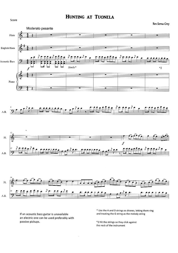 I wrote this set of songs based off a chapter in the Kalevala, Finland's national epic, with the intentions of making a larger song cycle. In this chapter of the Kalevala, Lemminkainen, young and cocky, has gone off to Northland (Norway), where he sees the daughter of the lord of Northland ad decides he wants to marry her. The Lord of Northland tells Lemminkainen that in order to marry the maiden of Northland, he must first catch (or kill, depending on the translation) hell's horse, hell's elk, as well as the swan of the river of death. The first song comes in while Lemminkainen is hunting for these creatures, eventually coming to Tuonela where he sees the swan in its calm and beauty. While he is gazing at the swan, Dripcap, the blind woodcutter of Northland stumbles upon Lemminkainen, murders him, dismembers him and dumps his body into the River of Death.