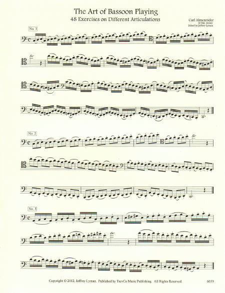 In his complete method for bassoon (Die Kunst des Fagottblaesens) from 1843, Carl Almenraeder hoped to fill a void in what he called "the utter lack of properly organized methods for this instrument". In the book he leads the student from playing the first pitches through a highly advanced level of technical proficiency, while at the same time espousing the advantages of playing his newly designed instrument, which he sold through the Schott company in Mainz. These 48 exercises appear in chapter 10 of the method.