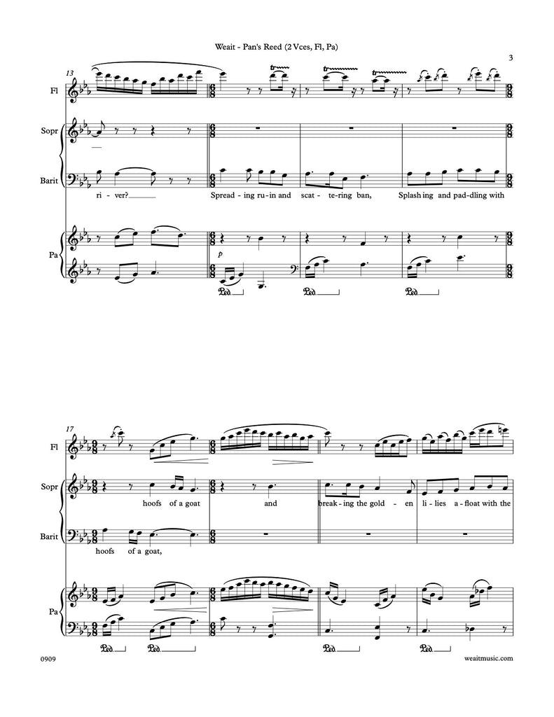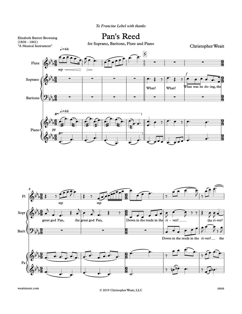 Elizabeth Barrett Browning's dramatic description of the god Pan's creation of his flute. A setting for soprano and baritone voice with obbligato flute and piano