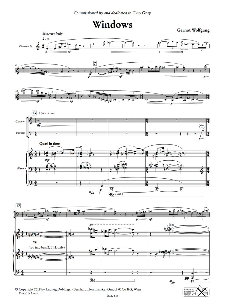 Windows was commissioned in 2014 by Gary Gray, former principal clarinetist of the Los Angeles Chamber Symphony.