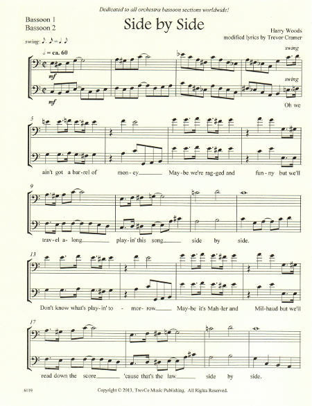 The camaraderie amongst bassoonists is legendary, and orchestra sections remain together for many years. Sitting "Side by Side" one gets to know one's colleague quite well. The performers are encouraged to both play and sing (repeating sections as necessary) using the slight modification to the lyrics of the 1927 classic, which have been provided by the arranged. Perhaps this is a suitable encore after a performance of the Vanhall, Dietter, Johansen, or other concerto for two bassoons?